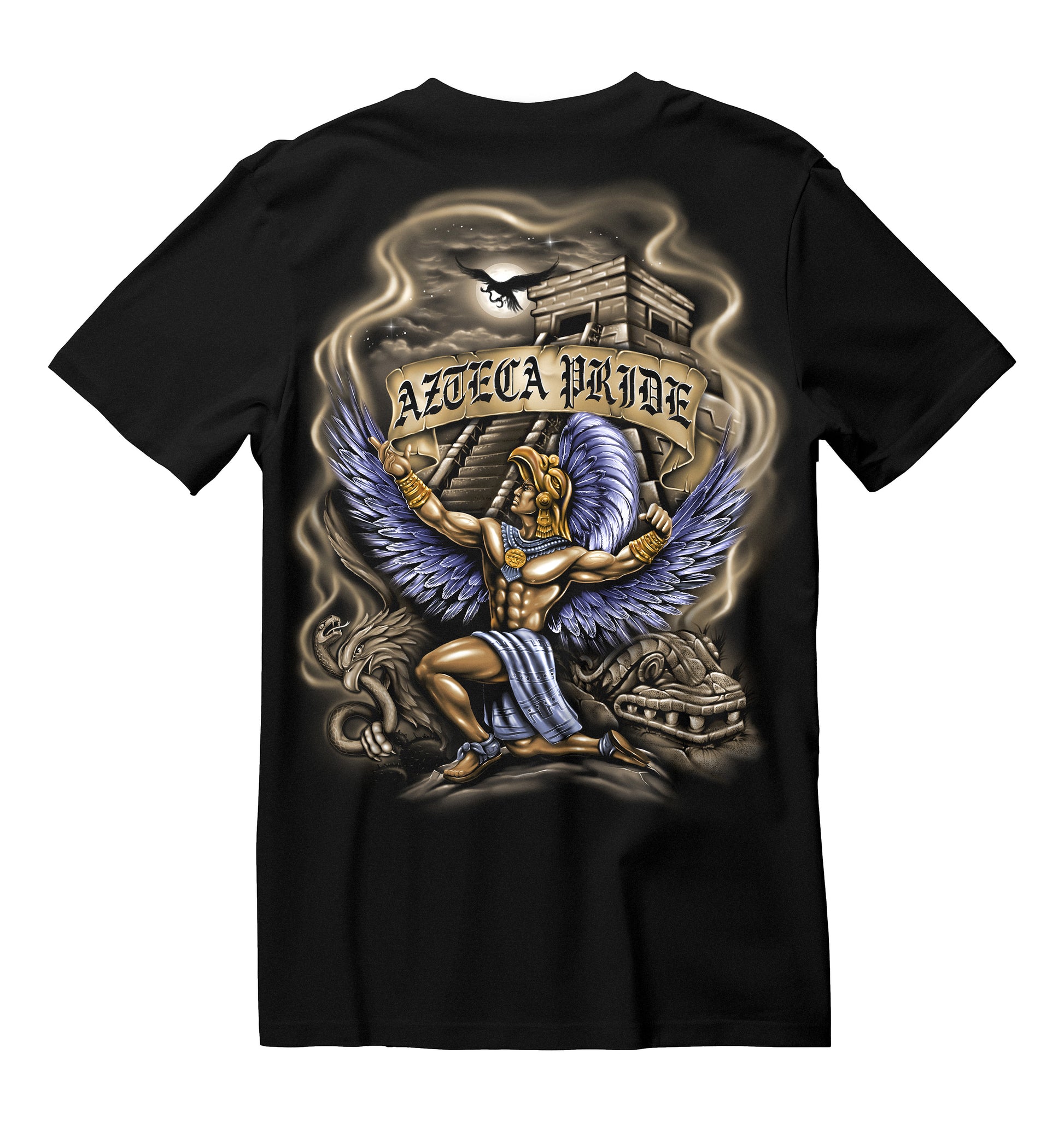 Show off your roots with this bold Azteca Pride tee - a powerful tribute to our cultura and heritage. Featuring an airbrushed-style graphic of a fierce Aztec warrior with vibrant blue wings, flanked by Quetzalcoatl and ancient ruins under a moonlit sky. “AZTECA PRIDE” is emblazoned across a scroll banner, representing strength, legacy, and the spirit of our ancestors. Printed on a high-quality black tee, this shirt stands as a statement of identity and pride.