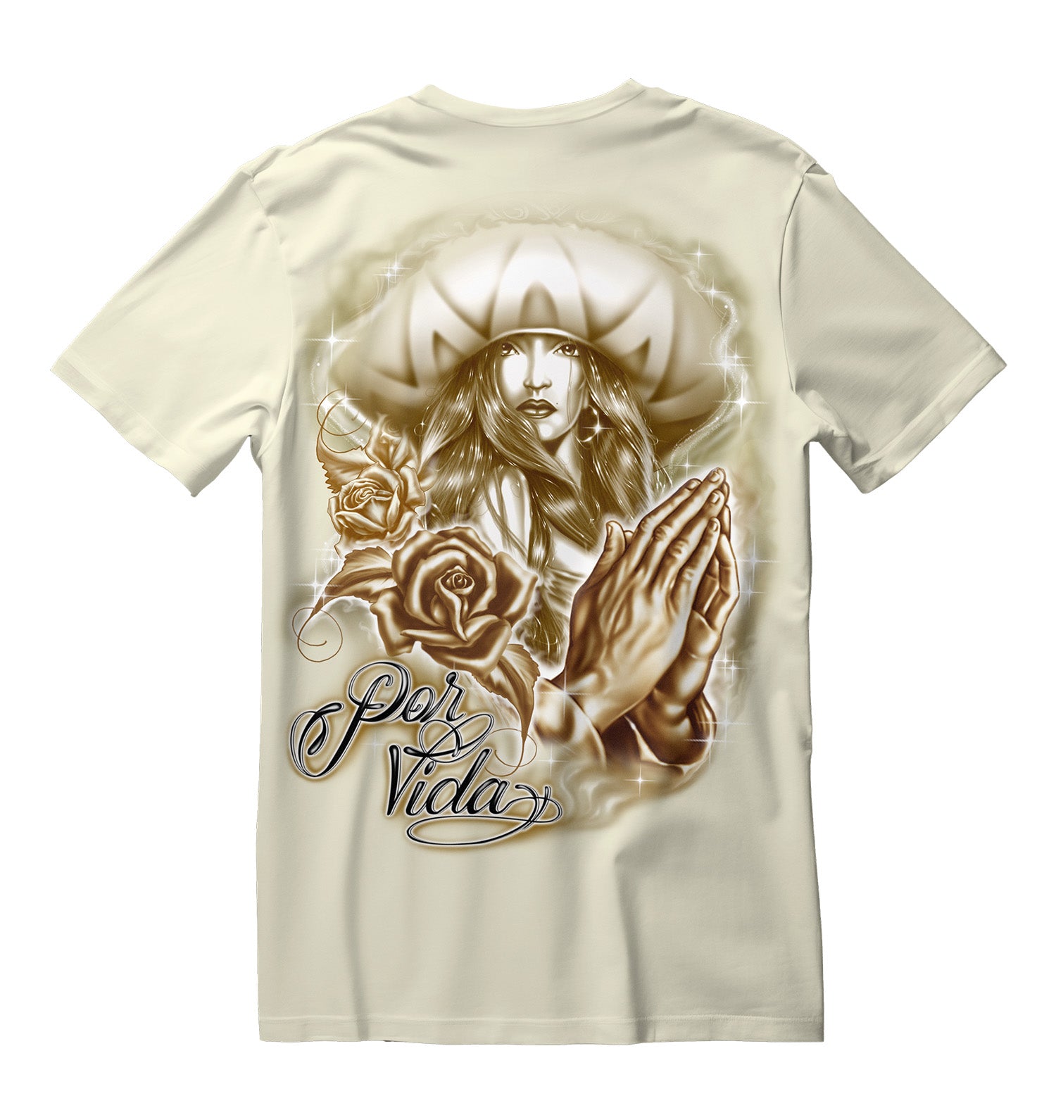 Featuring a stunning airbrush-style portrait of a Chicana in a wide brim hat surrounded by roses and praying hands, this design blends spirituality with street soul. The soft golden tones and script lettering give it that timeless lowrider aesthetic — classic, clean, and full of meaning.